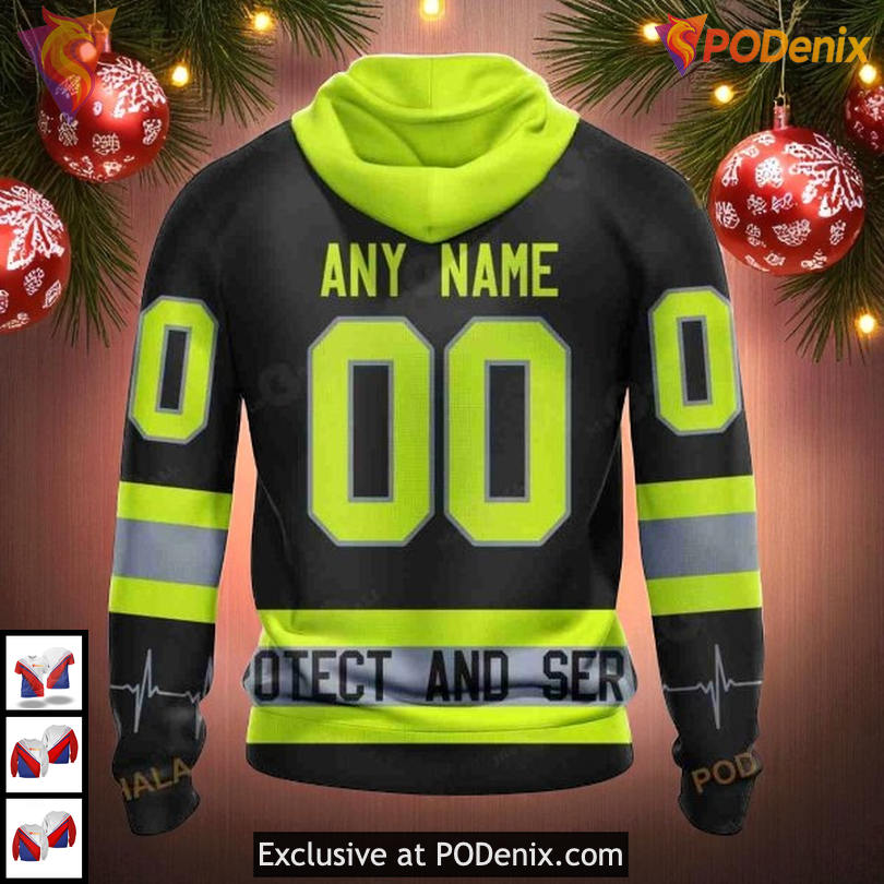 Anaheim Ducks Custom Name 3D Hoodie captures the bold firefighter tribute with neon reflective details and the proud quote Protect and Serve. A perfect mix of hockey passion and heroic spirit, ready to fire up your game day style.