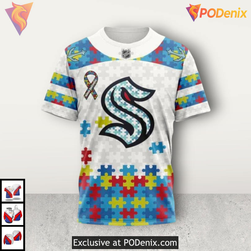 Product Information for Autism Awareness Tribute Edition NHL Seattle Kraken Winter Hoodie 3D: