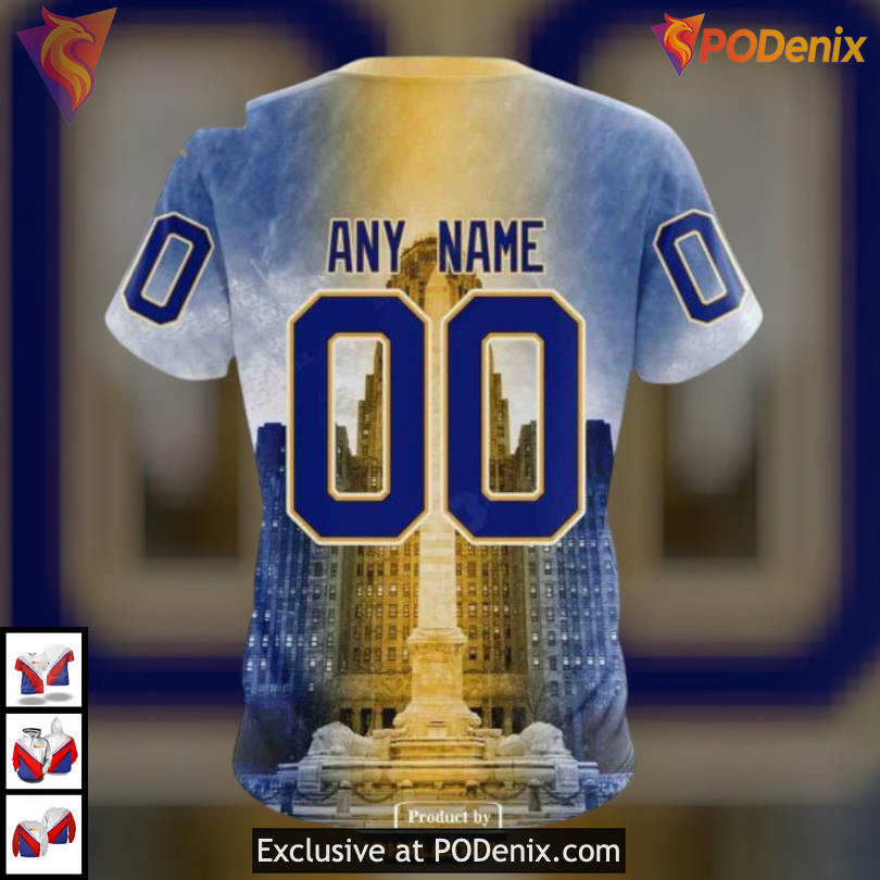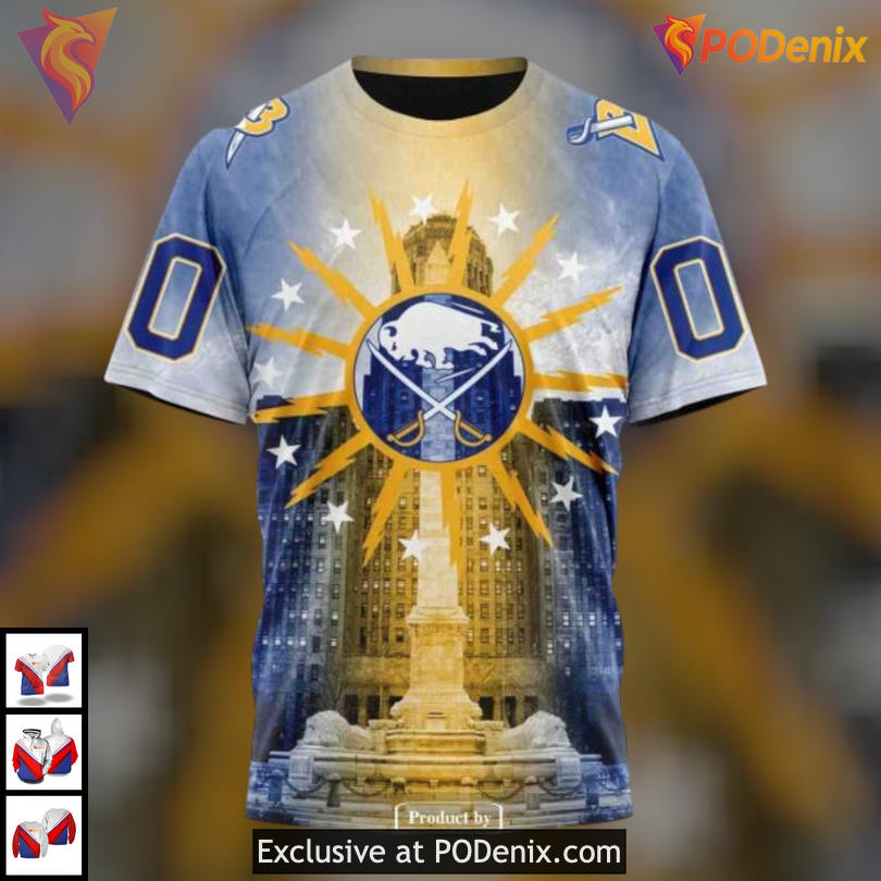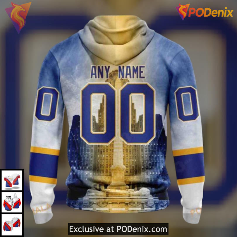 Product Information for Buffalo City Hall Landmark Artwork NHL Custom Name Buffalo Sabres Hoodie 3D: