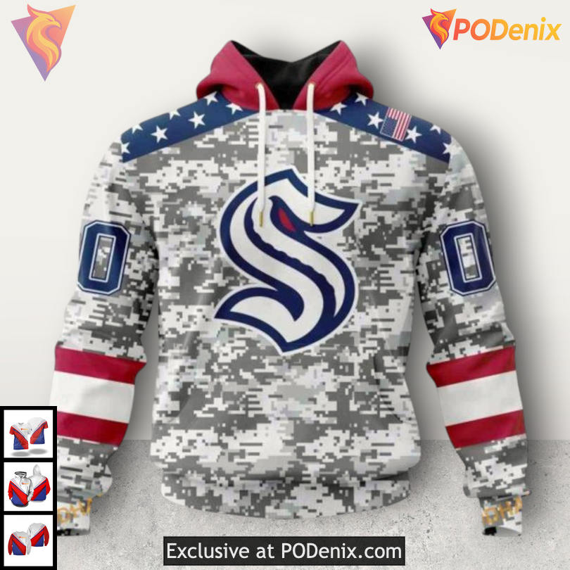 Product Information for Camo Veterans Day Tribute NHL Seattle Kraken Youth Hoodie 3D: