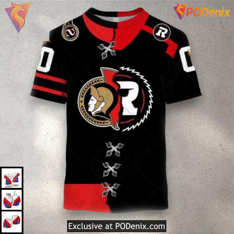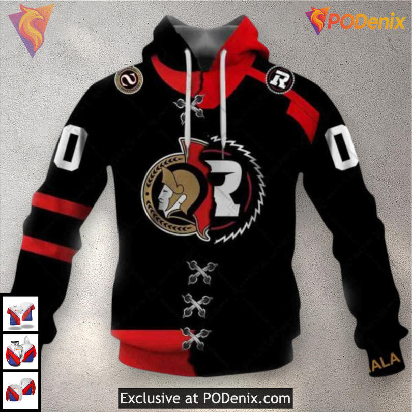 Product Information for CFL Ottawa Redblacks Mix Jersey Style NHL Ottawa Senators Zip Up Hoodie 3D: