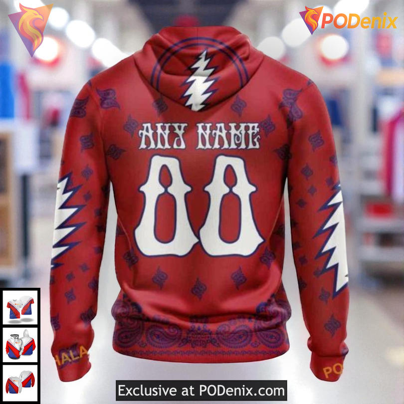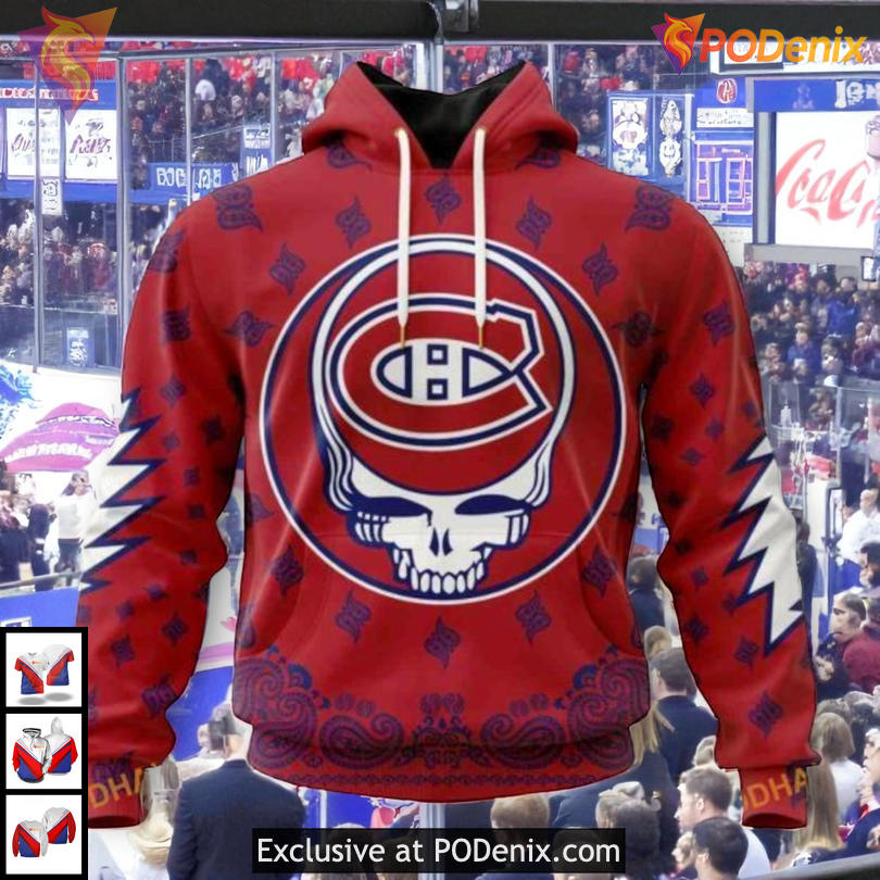 The Montreal Canadiens Hoodie showcases a vibrant tribute design featuring iconic motifs inspired by the Grateful Dead, including a striking skull graphic. The energetic colors and intricate details create a unique blend of hockey passion and music culture, perfect for any fan.