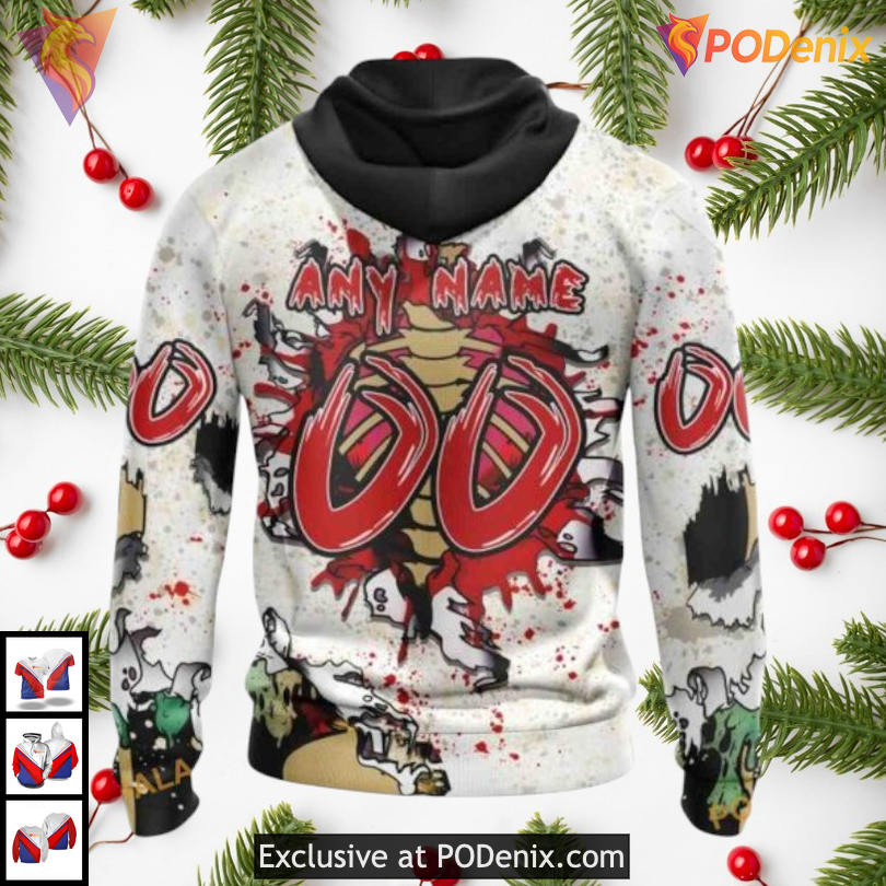 The Ottawa Senators Graphic Hoodie features a striking Halloween zombie design, blending vibrant colors with eerie motifs. This unique piece captures the spirit of the season, showcasing festive skulls and a thrilling camo pattern that energizes any fan’s wardrobe.