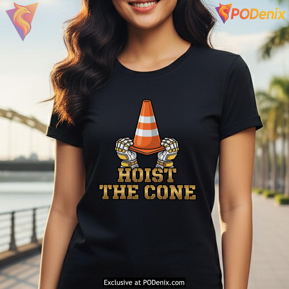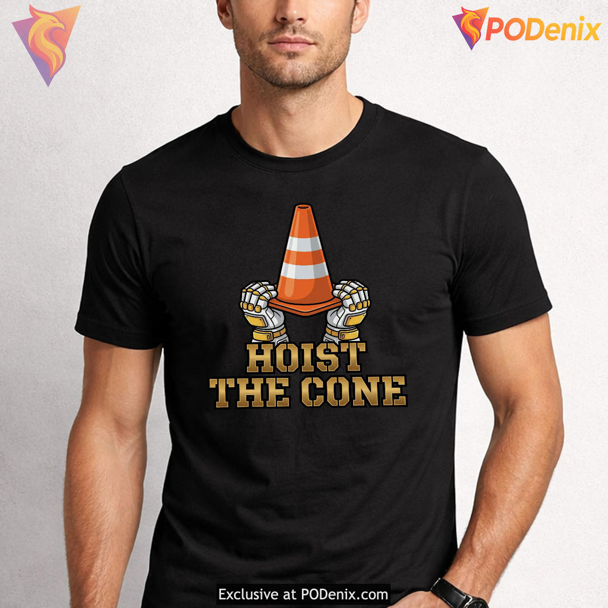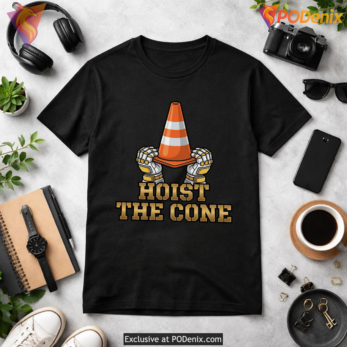 The artwork features a crisp, vector-style illustration of white and yellow batting gloves triumphantly lifting a bright orange and white traffic cone. Set against a dark background, the vibrant collegiate-style typography spells out “HOIST THE CONE” in bold yellow lettering, creating a striking visual contrast. This dynamic sports graphic perfectly embodies the energy of a funny home run tee, making it an absolute standout for any die-hard fan looking to showcase their team pride with a sense of humor.