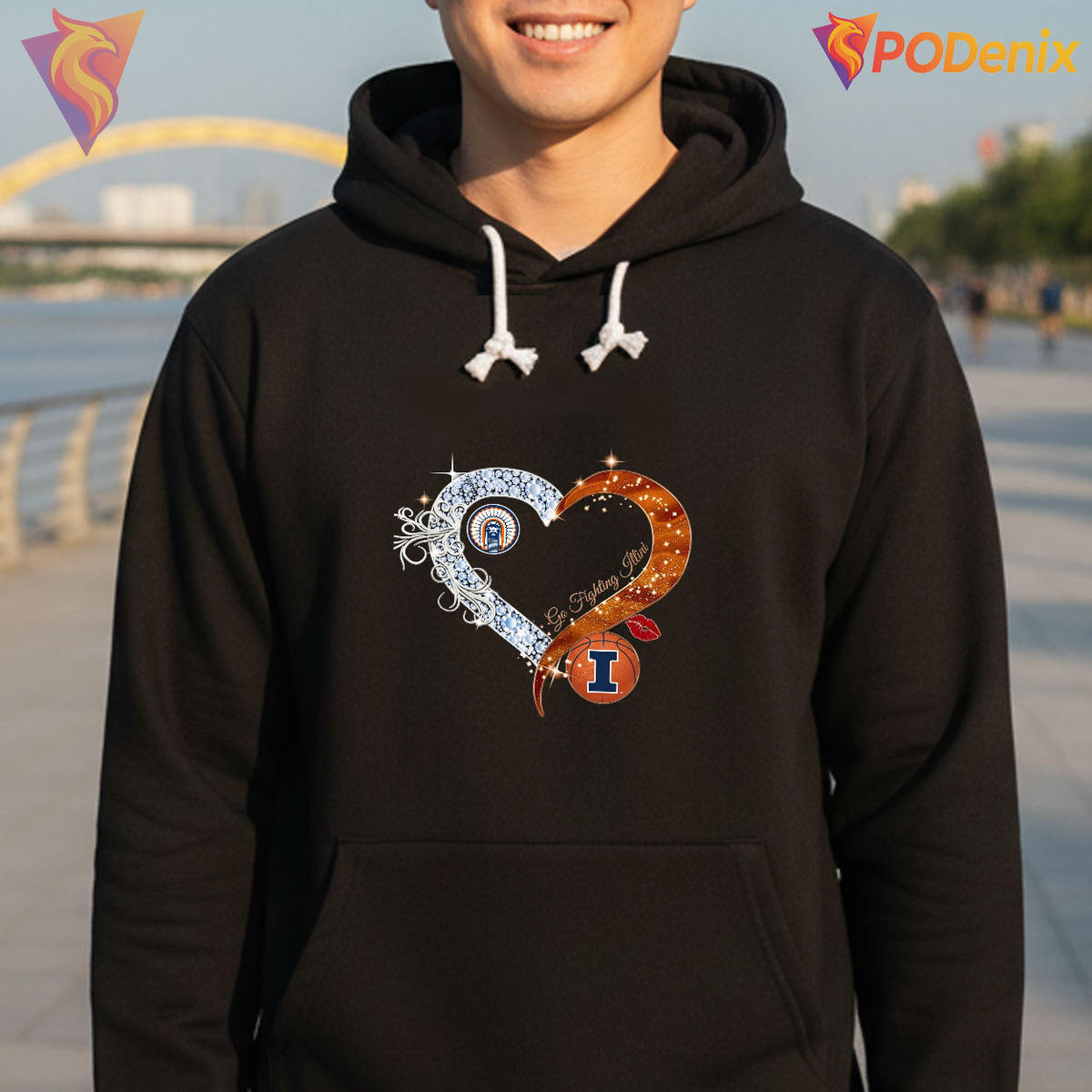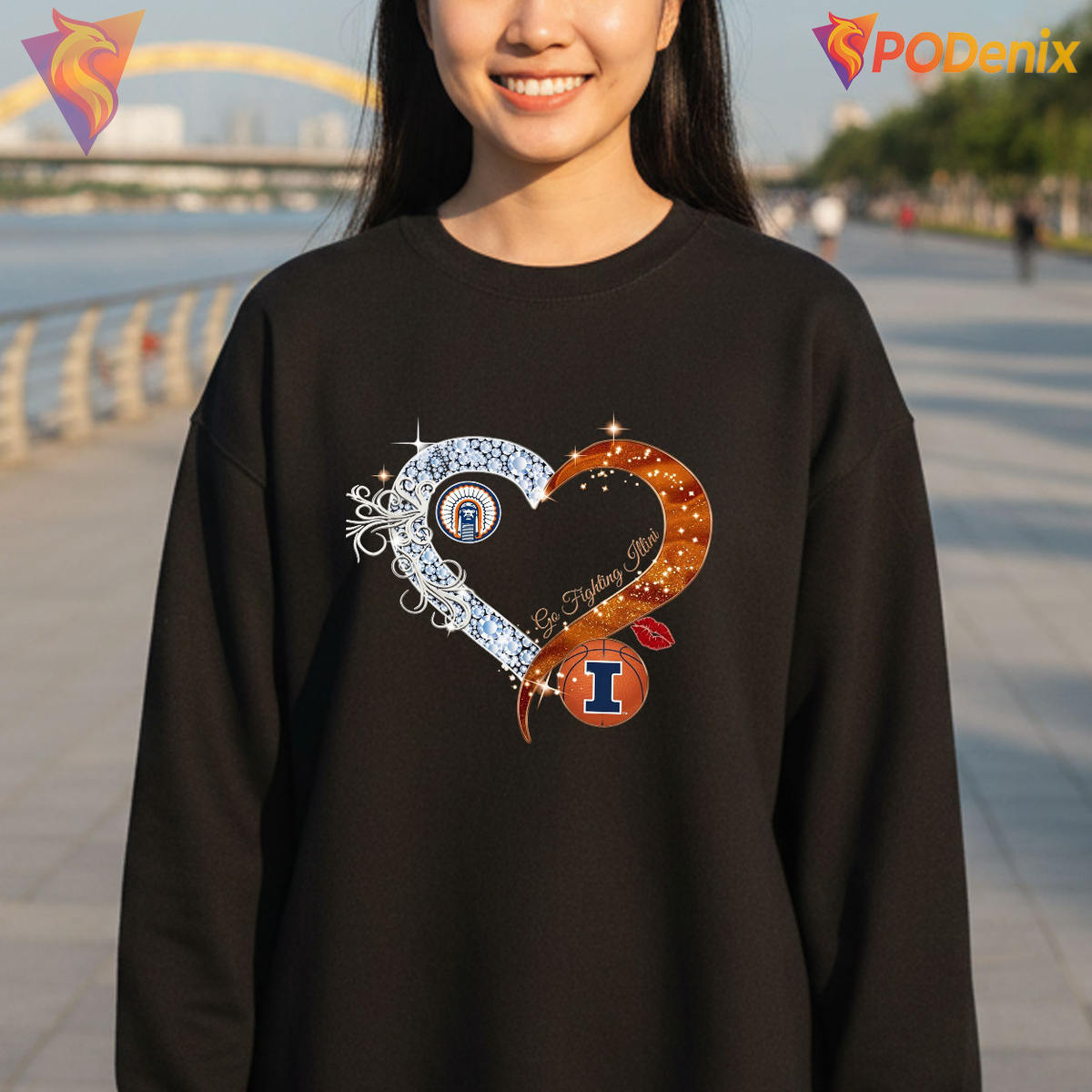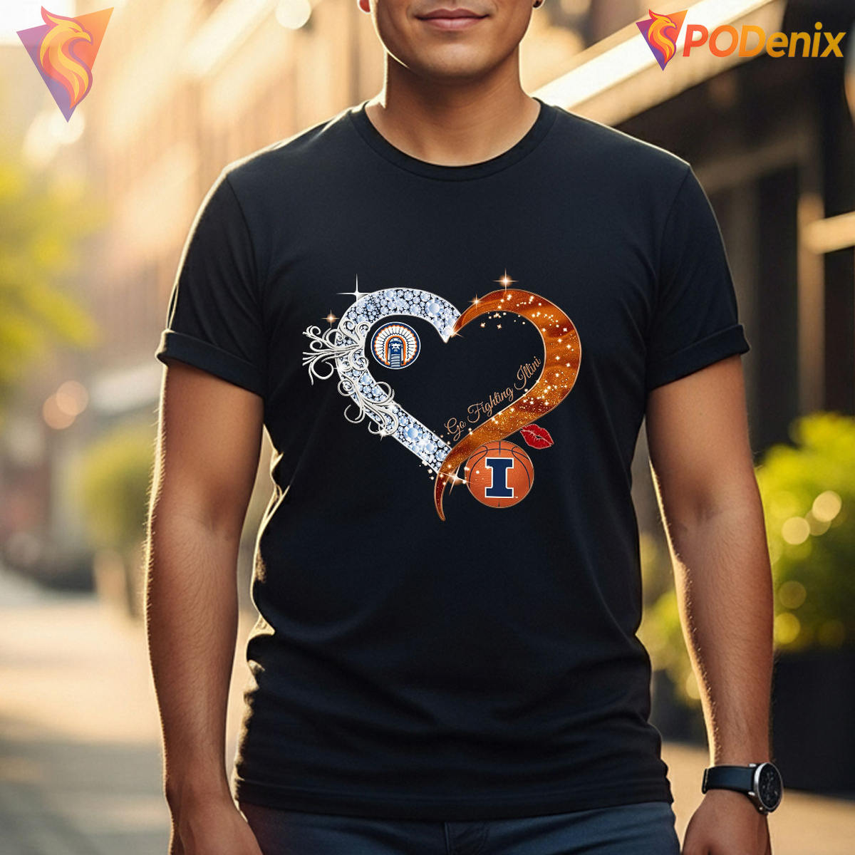 Elevate your game-day wardrobe with this stunning Illinois Fighting Illini women’s basketball shirt, designed specifically for the fashion-forward fan. Set against a classic dark background, this striking piece features a dazzling half-diamond, half-glitter heart motif that perfectly captures your team spirit with a touch of glamour.