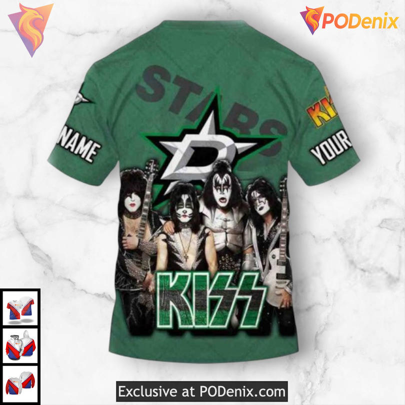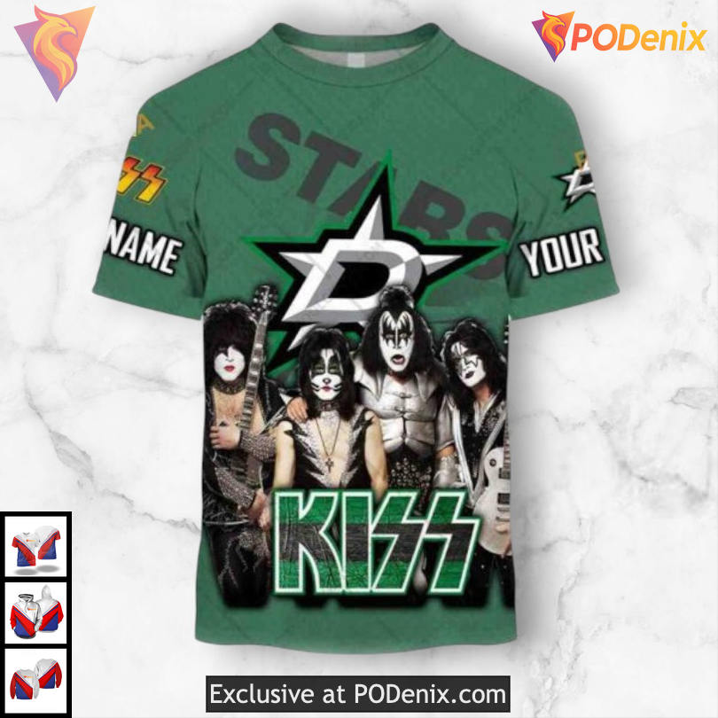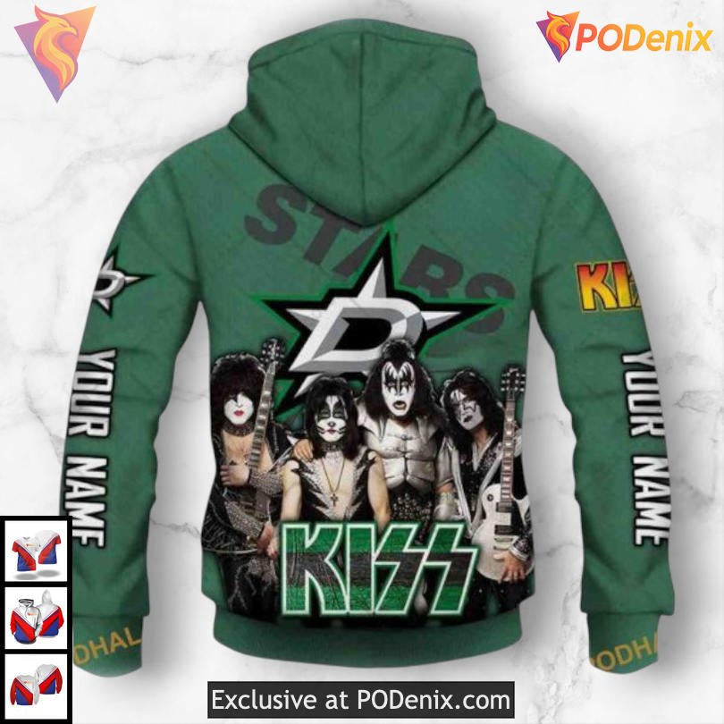 Product Information for Kiss Band Inspired Retro Crossover Custom Name Dallas Stars Hoodie 3D Shirt: