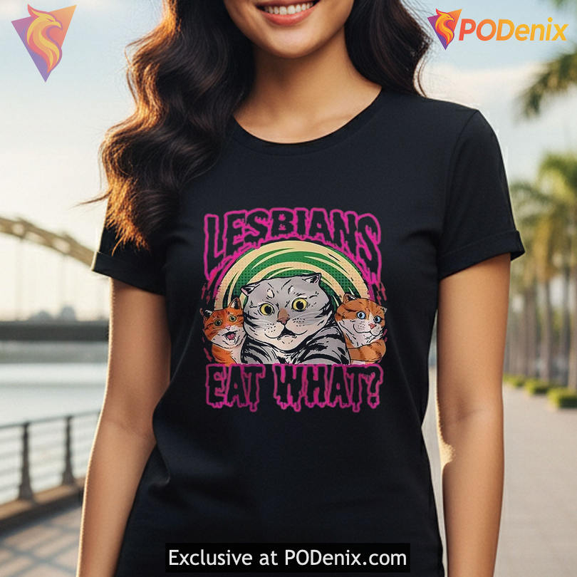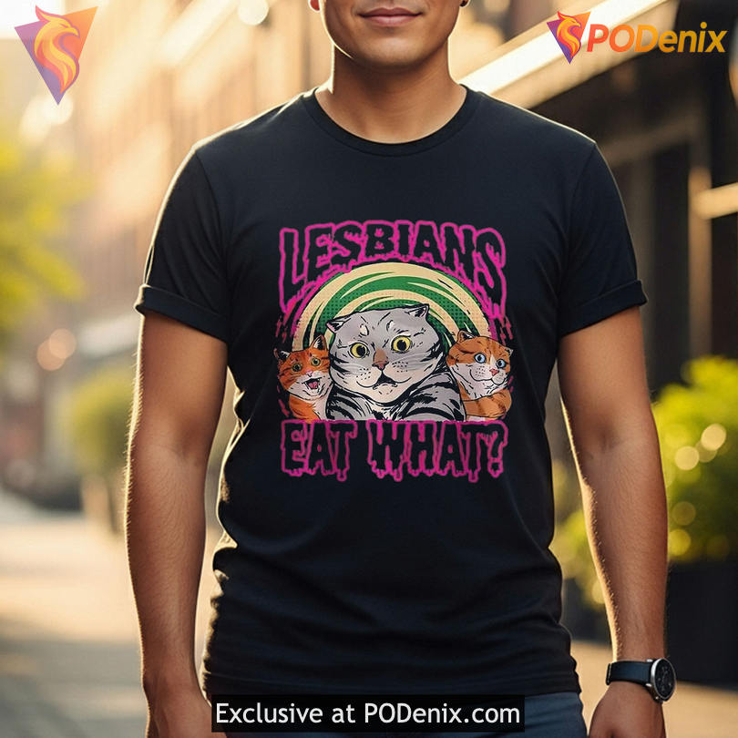 Lesbians Eat What T Shirt showcases three funny cats with shocked faces framed by vivid neon tones. The playful phrase captures queer humor perfectly, turning sarcasm and surprise into an expressive piece of pride and self-acceptance through art and laughter.