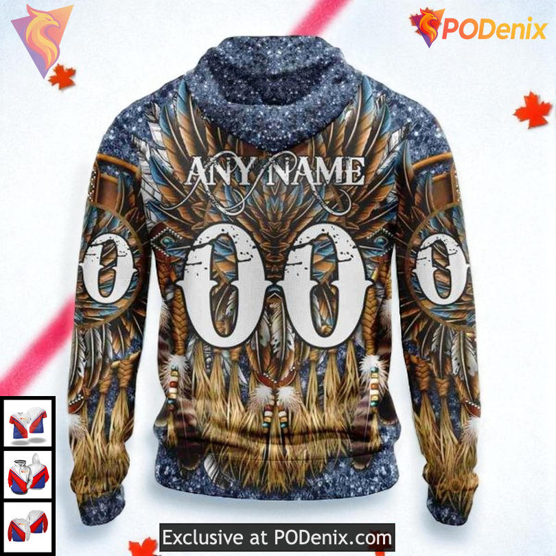 The Personalized Edmonton Oilers Hoodie features a vibrant design inspired by native costume elements, showcasing intricate patterns and bold colors that embody the spirit of the Edmonton Oilers. This unique piece captures the energy of fandom while celebrating cultural artistry.