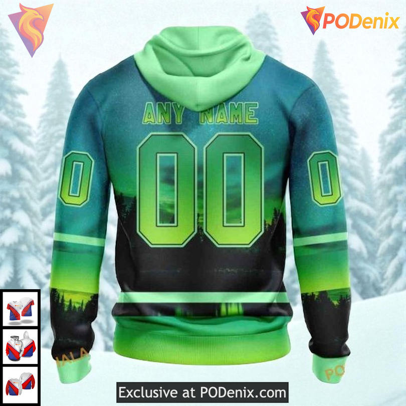 Exploring northern lights in sports fashion, this hoodie connects fans through shared experiences, evoking a sense of unity and excitement that resonates deeply within the community during game nights and special events.