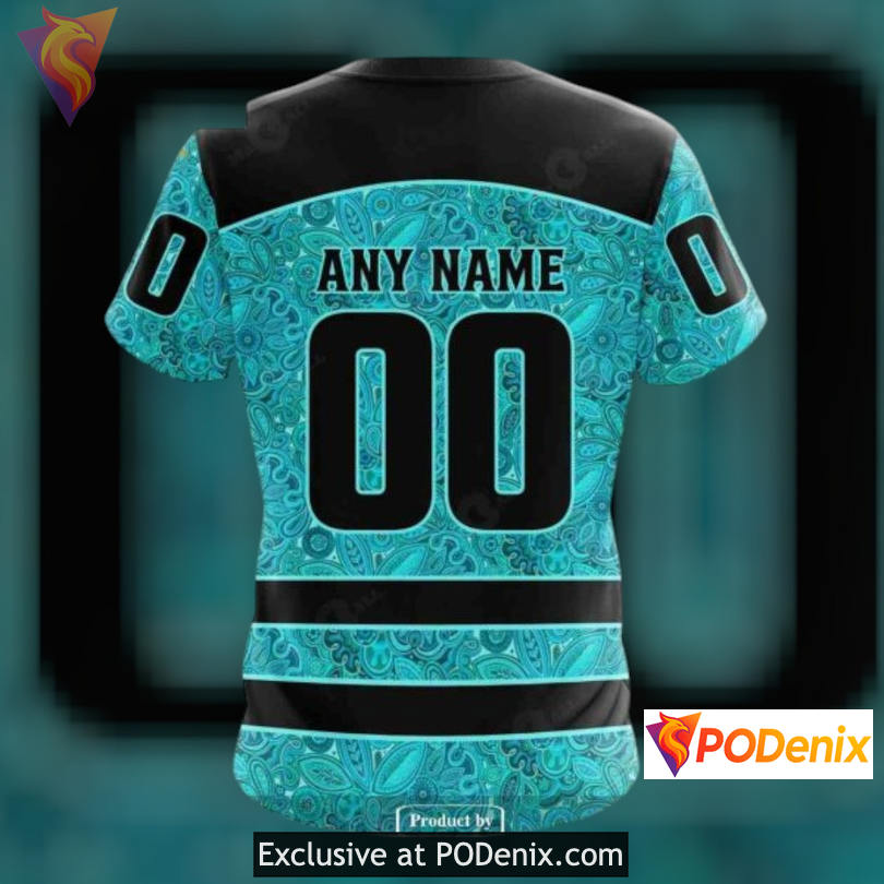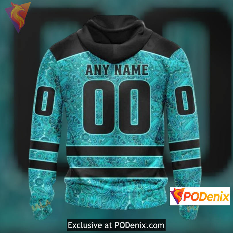 The New Jersey Devils Unisex Hoodie is a vibrant tribute to ovarian cancer awareness, featuring dynamic graphics and a striking color palette that resonates with fans. Its bold design reflects the team’s spirit while promoting a meaningful cause through sports.