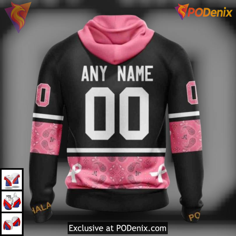 The Arizona Coyotes Womens Hoodie is a vibrant expression of team spirit, featuring a striking paisley breast cancer ribbon design. This unique piece melds support for breast cancer awareness with the bold colors of the Coyotes, making it an essential for any dedicated fan.