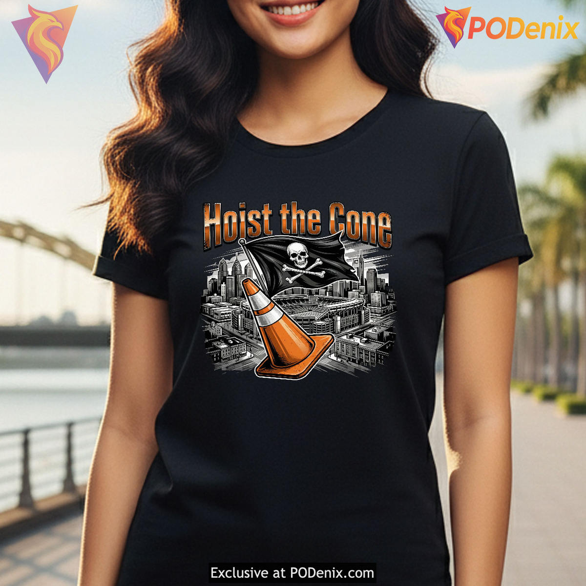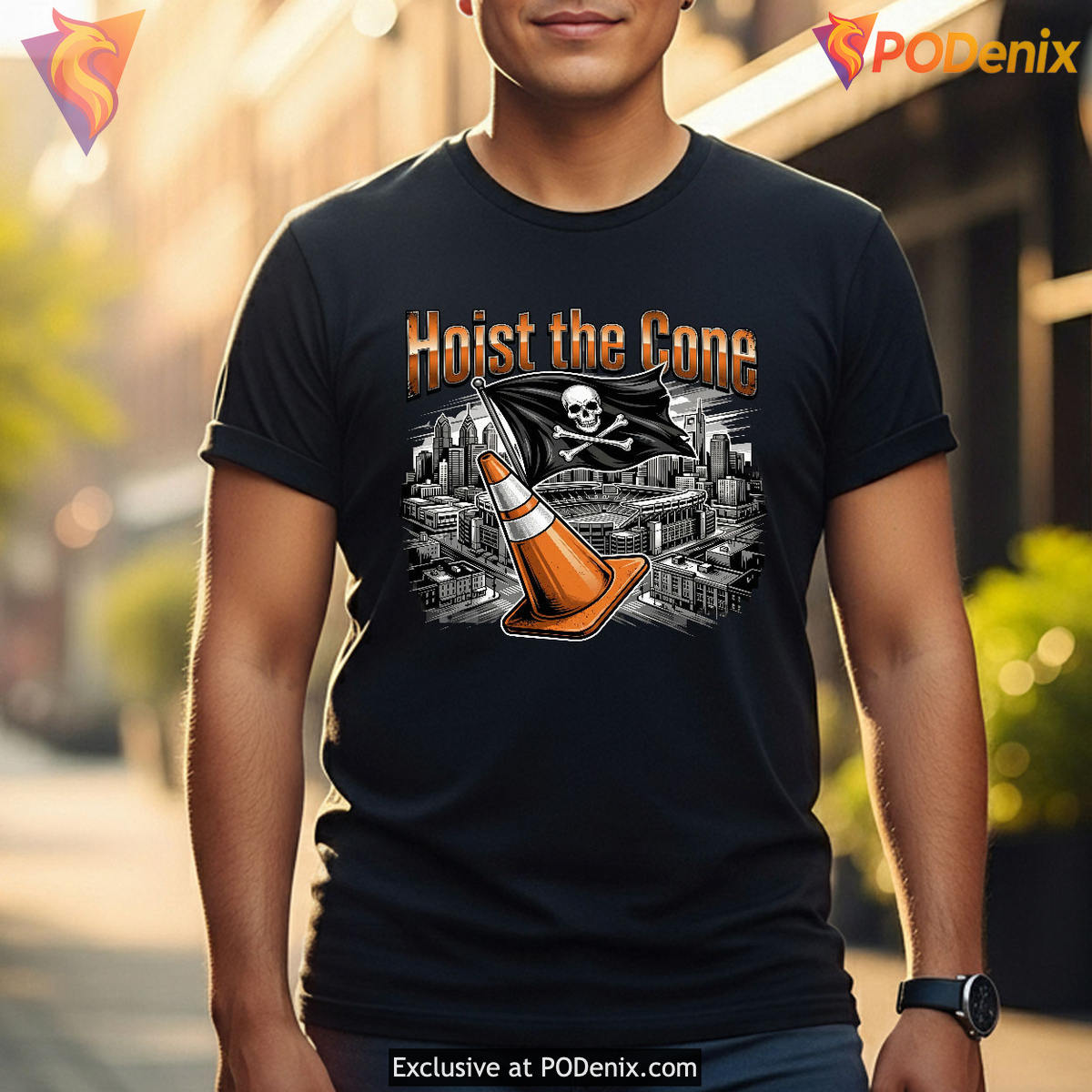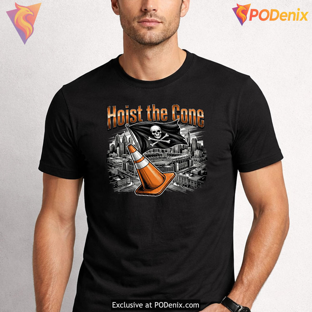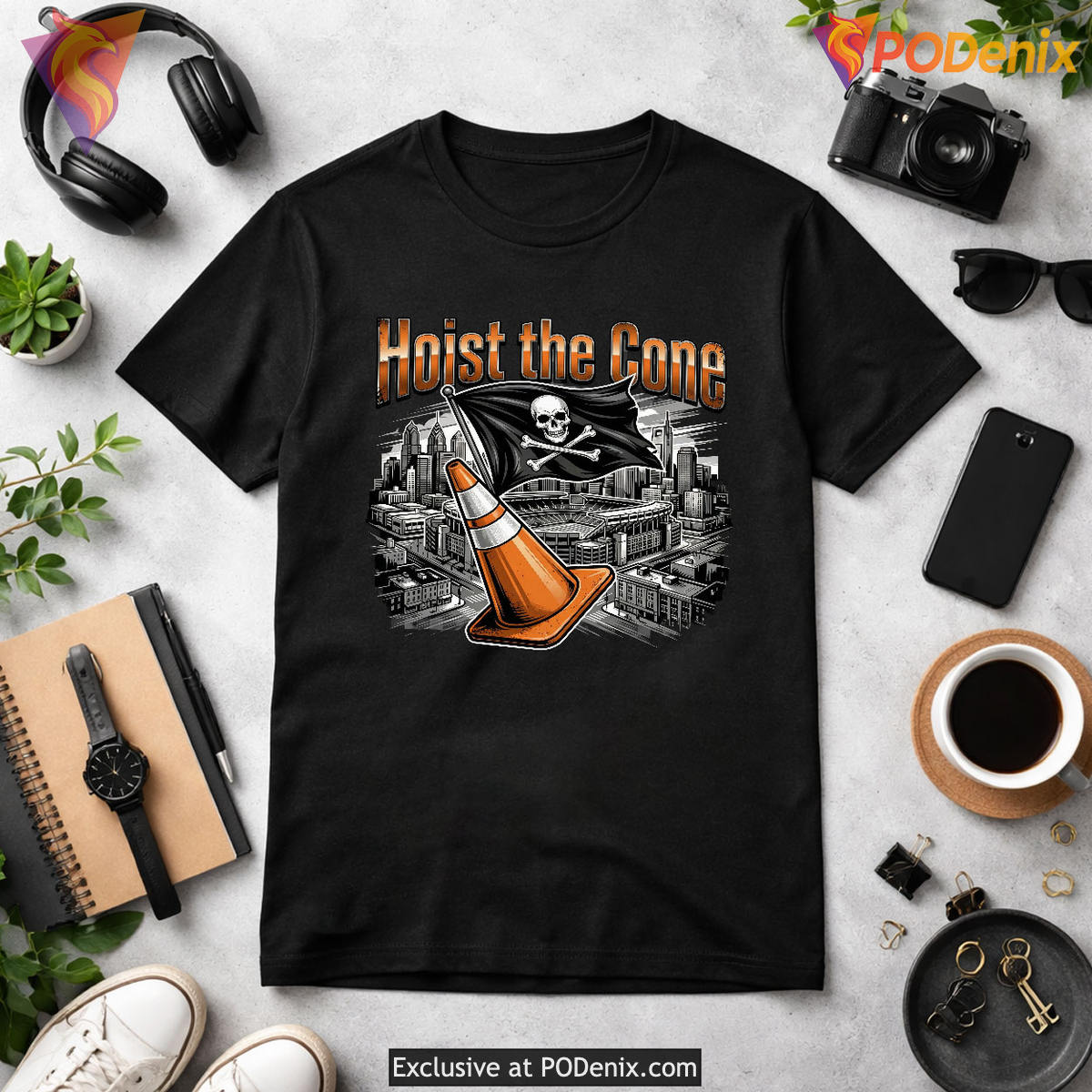 The artwork features a striking urban grunge streetwear aesthetic, contrasting a vibrant, metallic orange traffic cone against a moody, greyscale illustration of the Philadelphia skyline and stadium. A menacing Jolly Roger pirate flag is planted firmly in the cone beneath the towering “Hoist the Cone” typography, symbolizing the fierce loyalty of the fanbase and transforming a classic local parking meme into a legendary badge of honor.