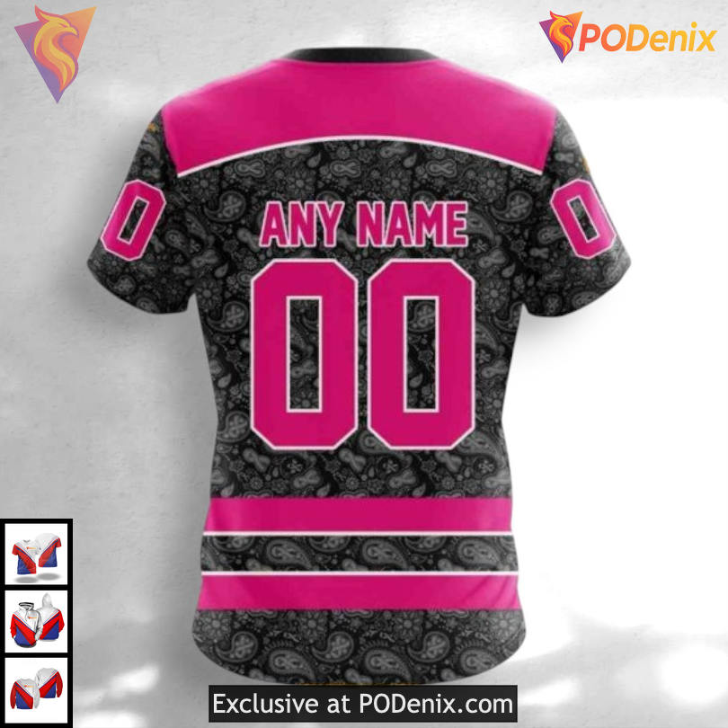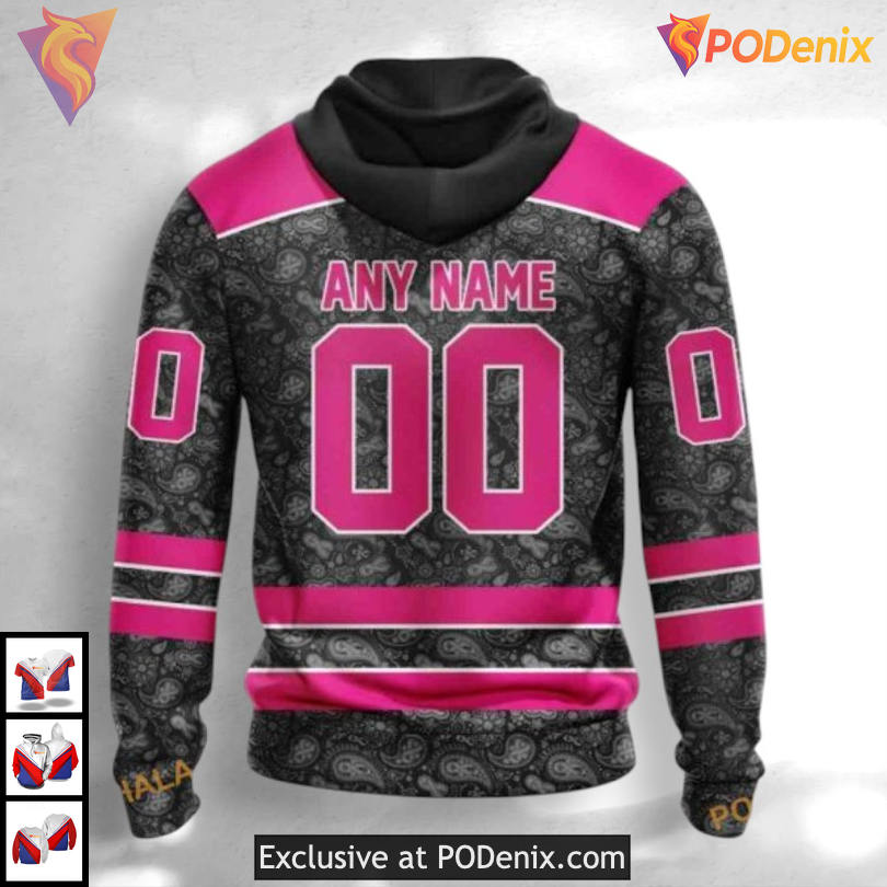 With custom designs for Pink In The Rink, this hoodie symbolizes solidarity and support for breast cancer awareness. It’s not just apparel; it’s a statement of unity among fans dedicated to making a difference.