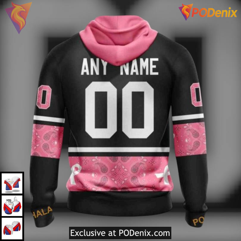 The Retro Buffalo Sabres Hoodie features a vibrant pink paisley design that captures the spirit of breast cancer awareness. With its eye-catching colors and unique patterns, this hoodie is a perfect blend of style and support for a meaningful cause.