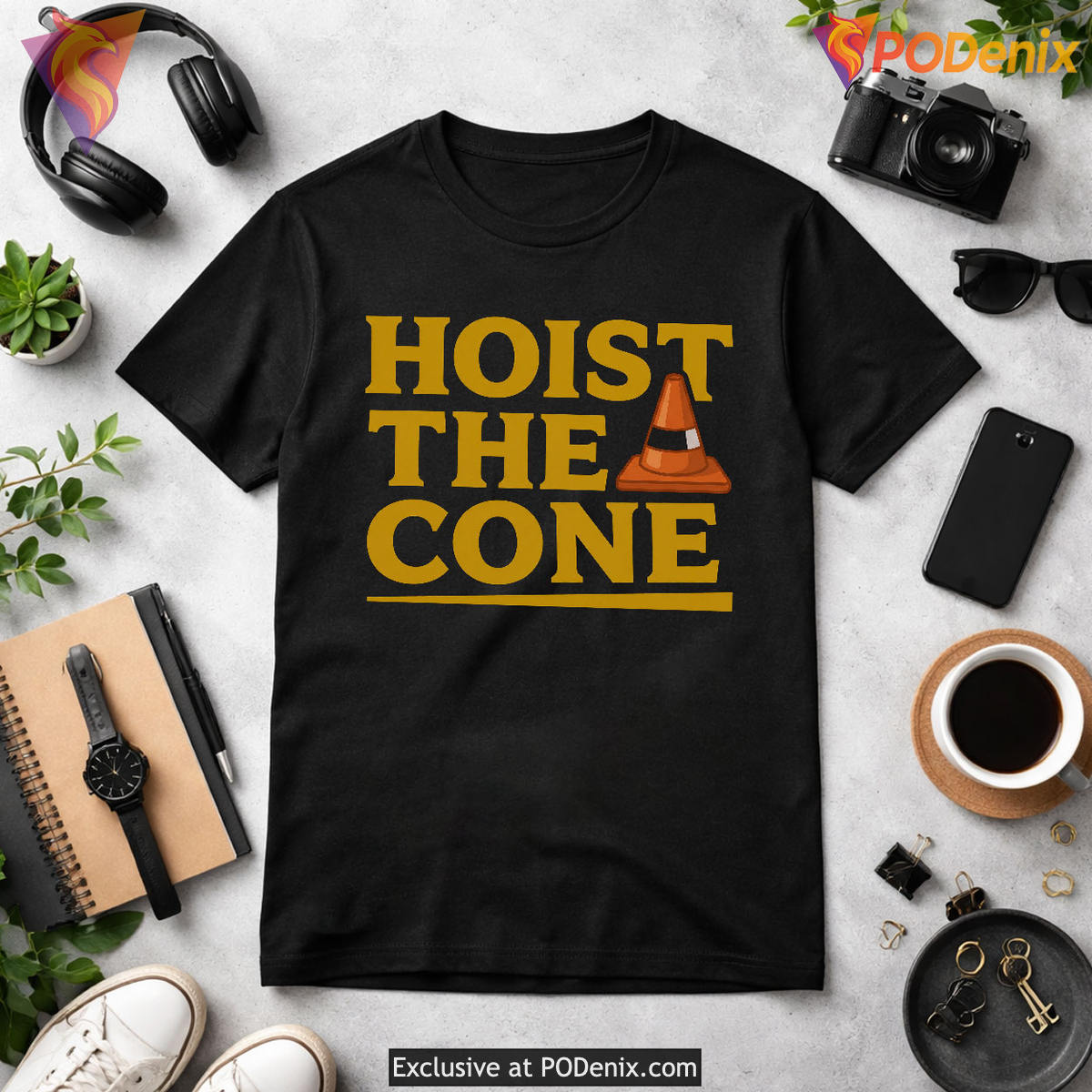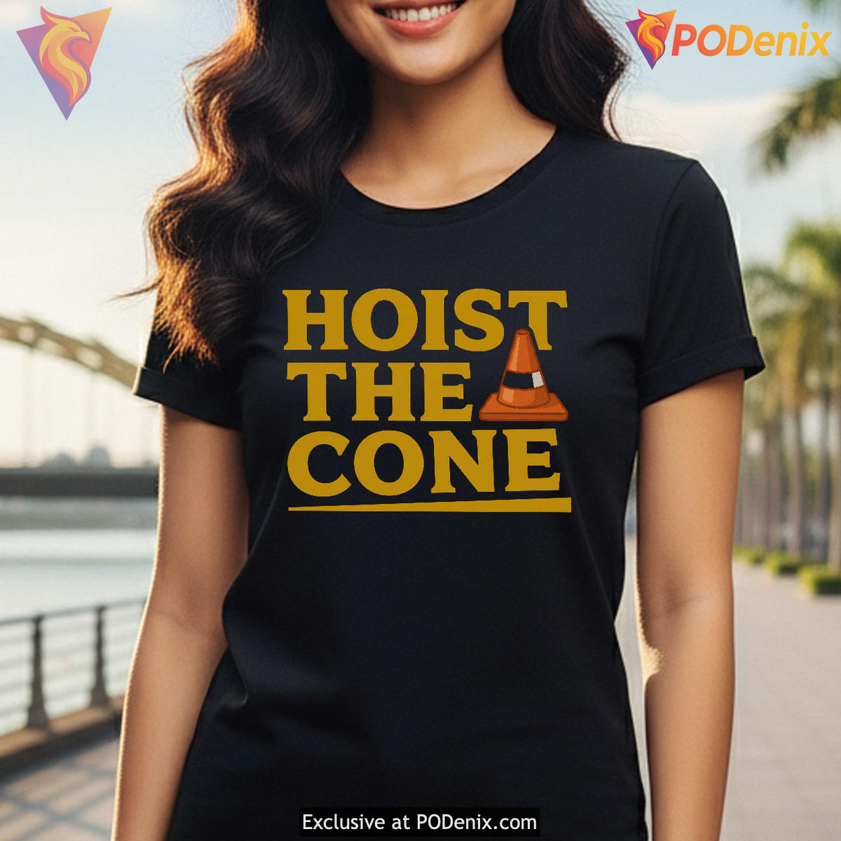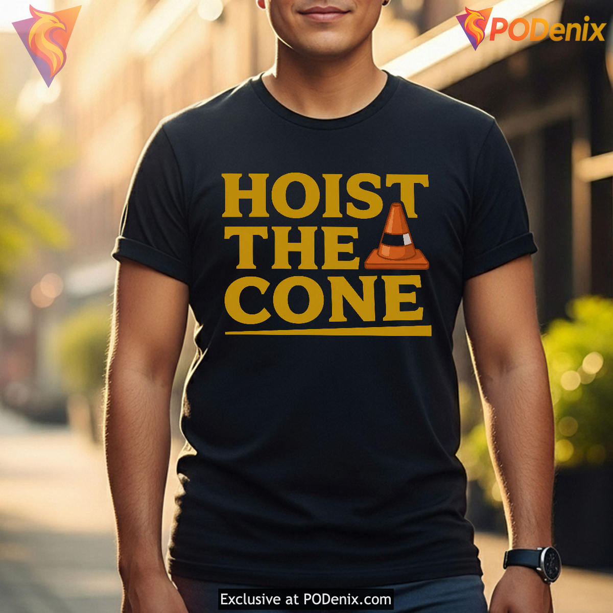 The visual impact of this piece relies on its striking, bold sans-serif typography that proudly spells out “HOIST THE CONE” across the chest. Anchoring the text is a crisp, minimalist illustration of a classic orange and white traffic cone, perfectly capturing the essence of a beloved Pittsburgh construction meme. Set against a deep black background, the vibrant yellow-gold lettering pays homage to the iconic black and gold fan gear worn proudly across the city’s stadiums and tailgate lots.