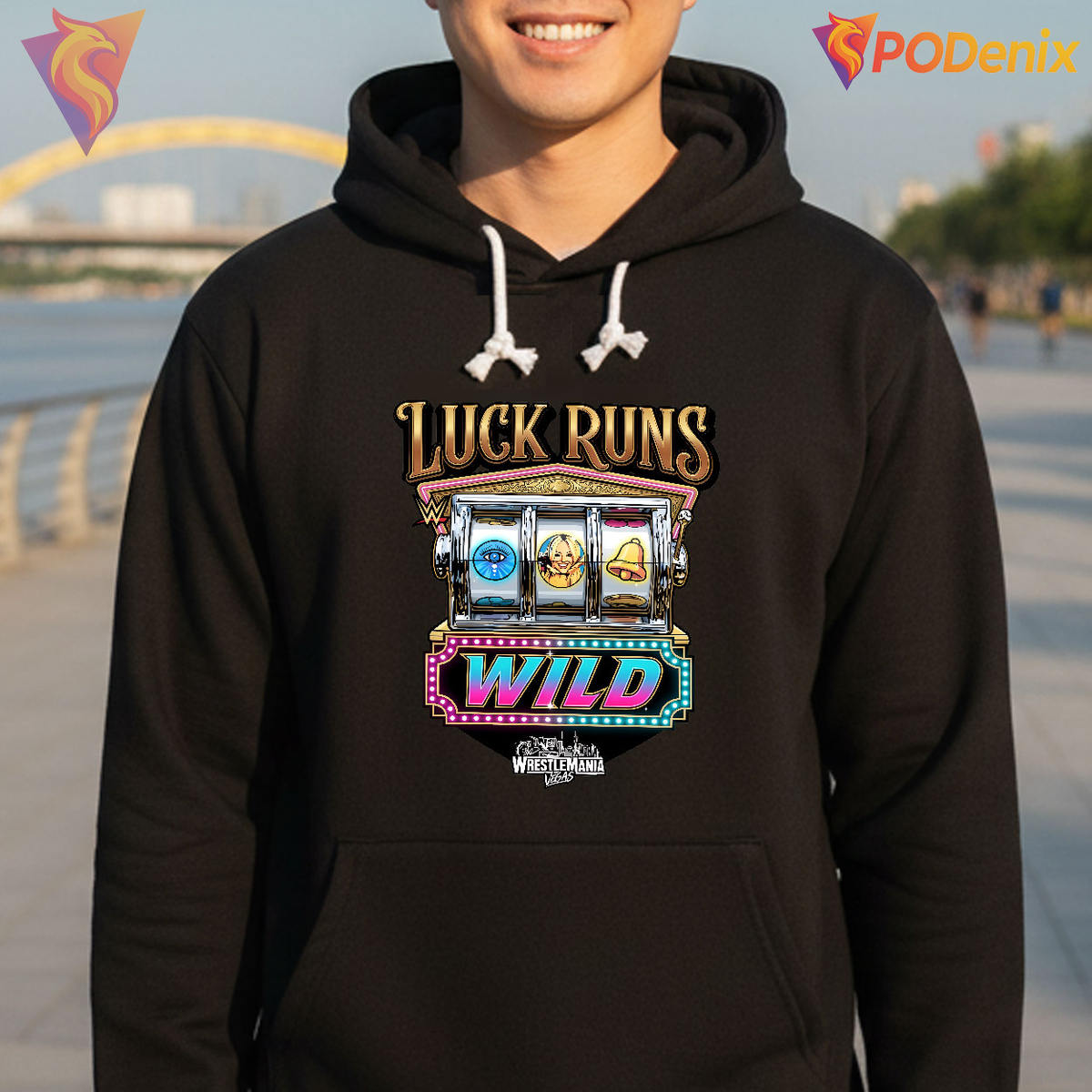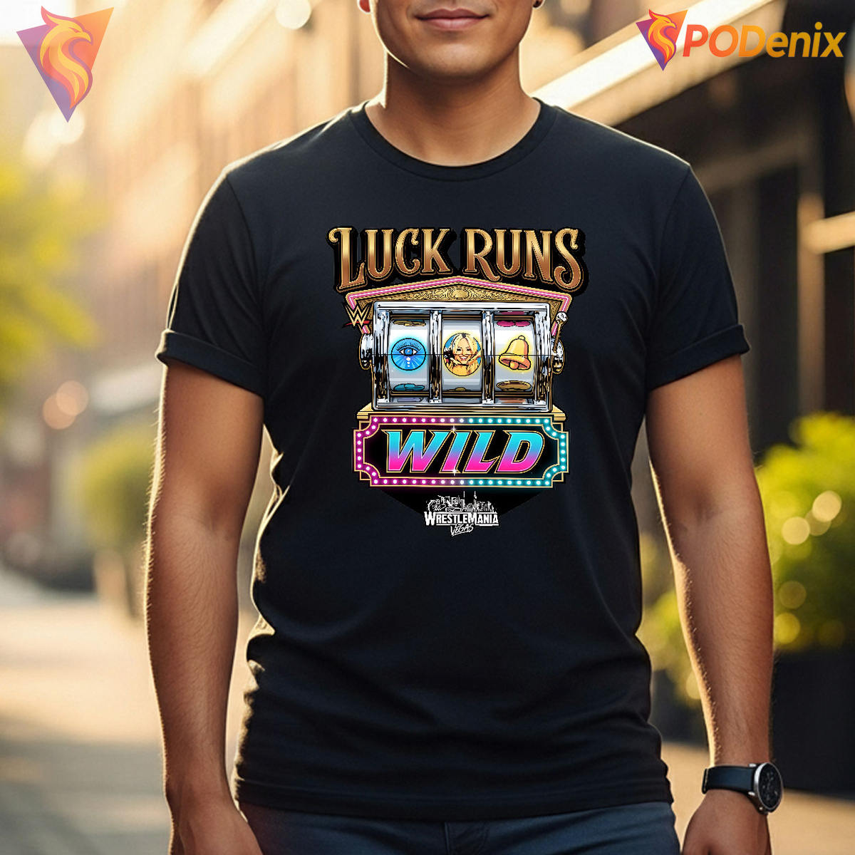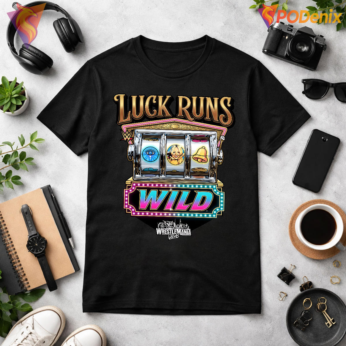This standout graphic puts a vintage slot machine right in the spotlight, blending classic lucky casino icons with a fiercely stylized portrait of the reigning blonde superstar. Gleaming metallic gold typography spells out “LUCK RUNS” across the top, while a dazzling pink and teal neon marquee illuminates the word “WILD” at the base. Finished with the official Vegas event logo and wrapped in authentic distressed textures, this dark-background tee delivers an unmatched 90s wrestling bootleg aesthetic.