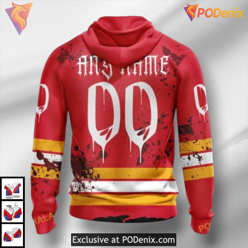 Calgary Flames Themed 3D Hoodie with Spooky Ribs Bone Design for Halloween