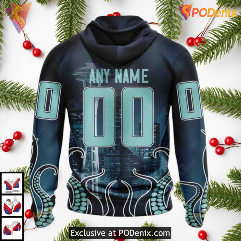 Product Information for Space Needle Skyline Inspired Artwork Seattle Kraken Christmas Hoodie 3D Custom: