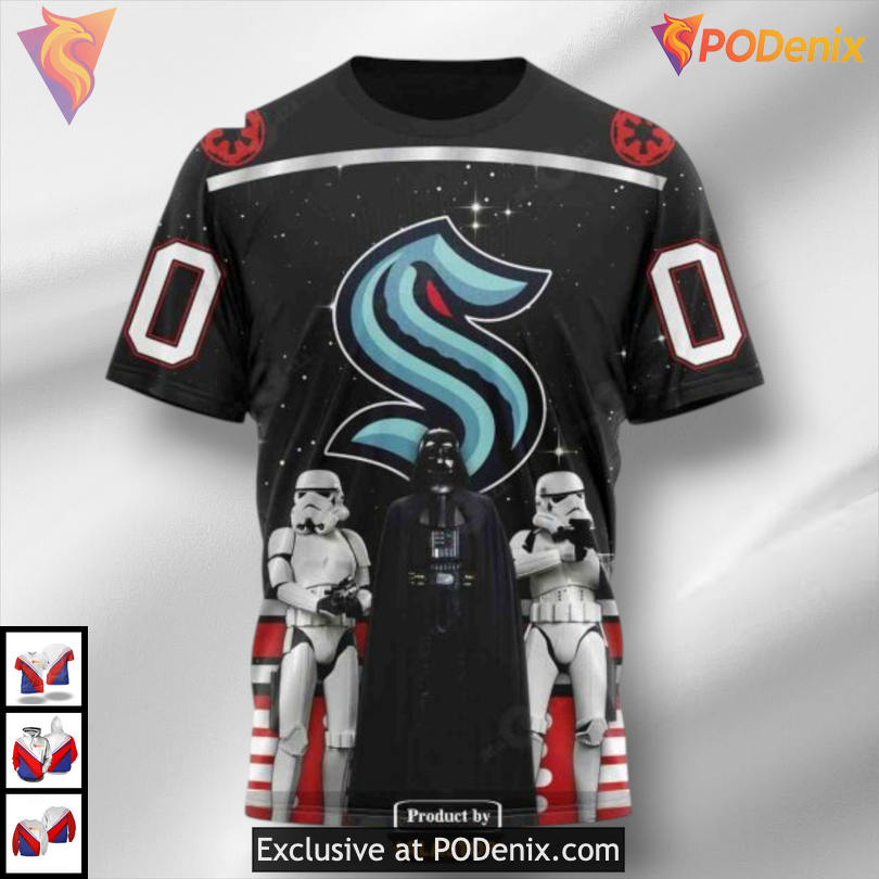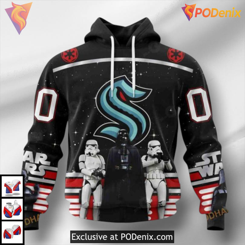 The Seattle Kraken All Over Print Hoodie boasts a striking design that merges the fierce energy of the Seattle Kraken with the iconic imagery of Star Wars. With bold black armor motifs and dynamic graphics, this hoodie captures the spirit of fandom in every stitch.