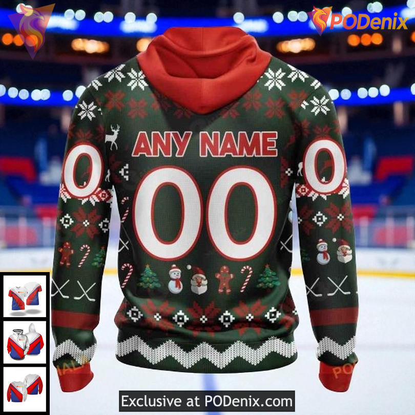 The festive design elements echo cultural traditions of Christmas, weaving together hockey passion and holiday joy. By pairing symbols like snowmen, trees, and reindeer, the hoodie creates a unique balance of fun and tradition that captures the spirit of winter celebrations.