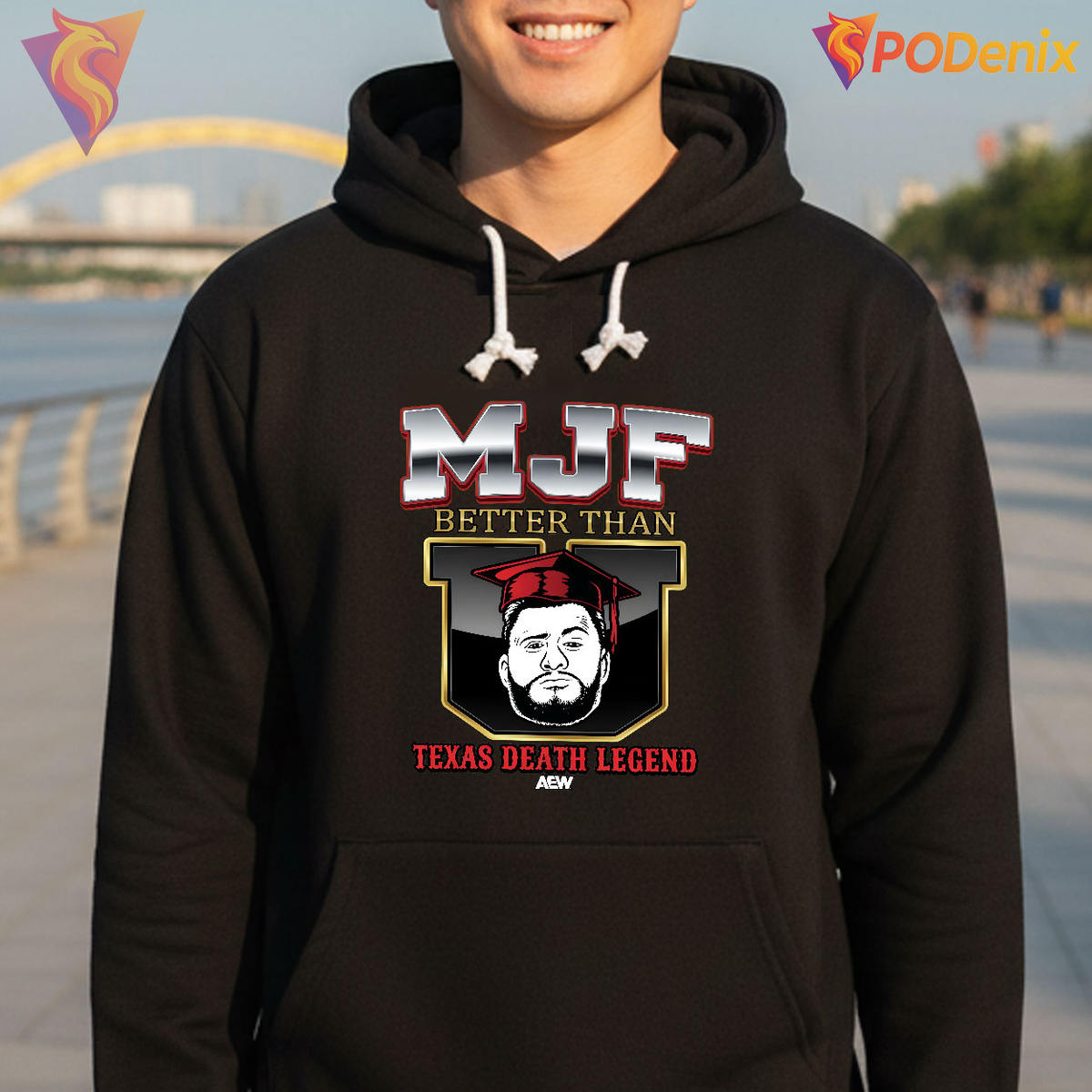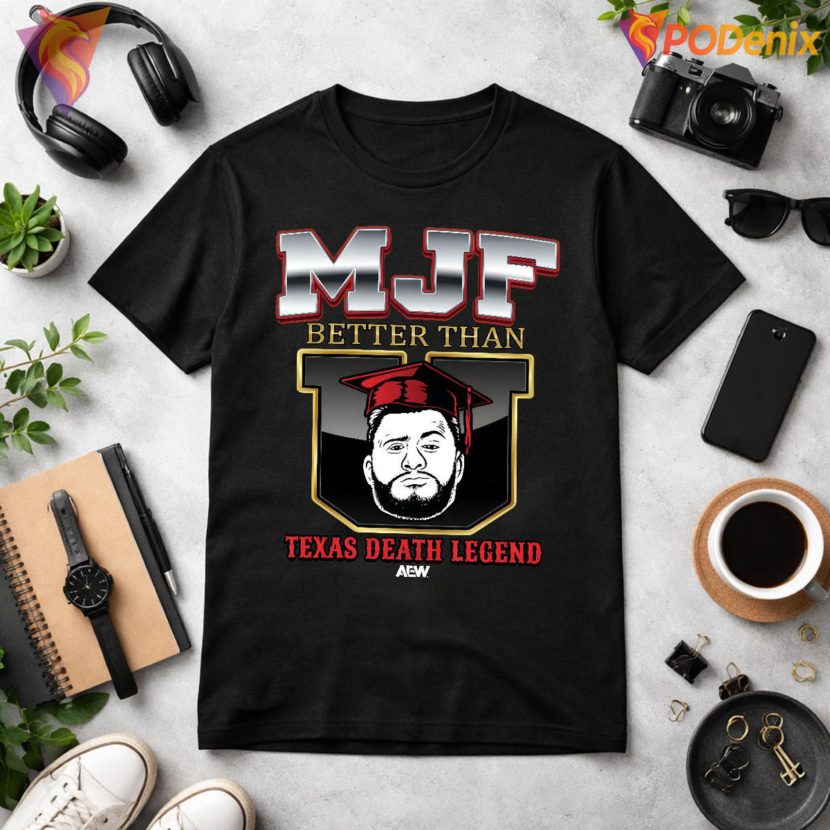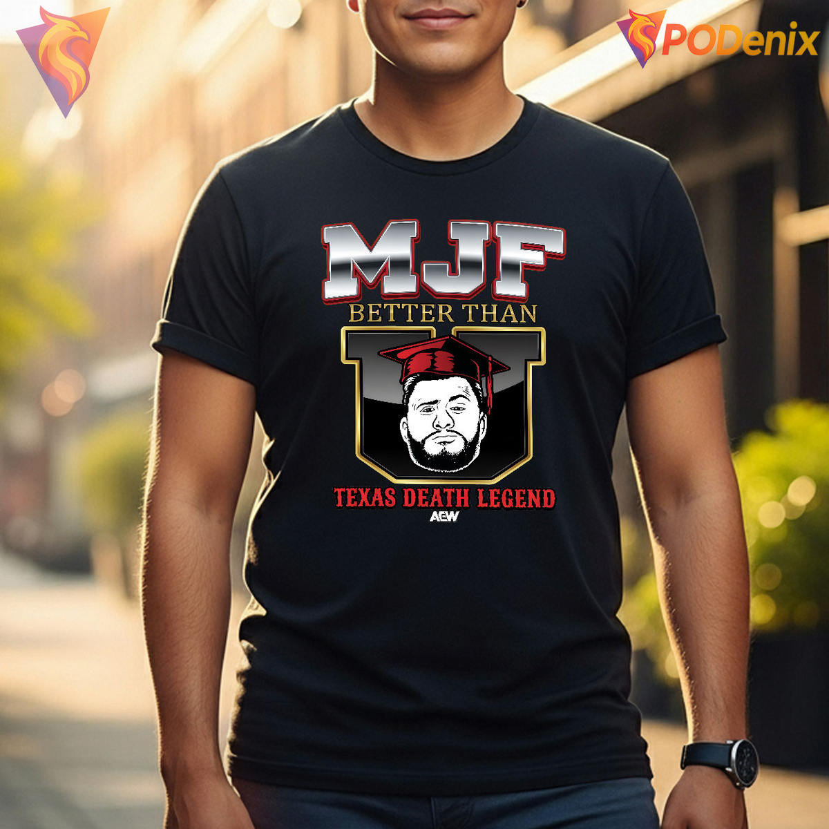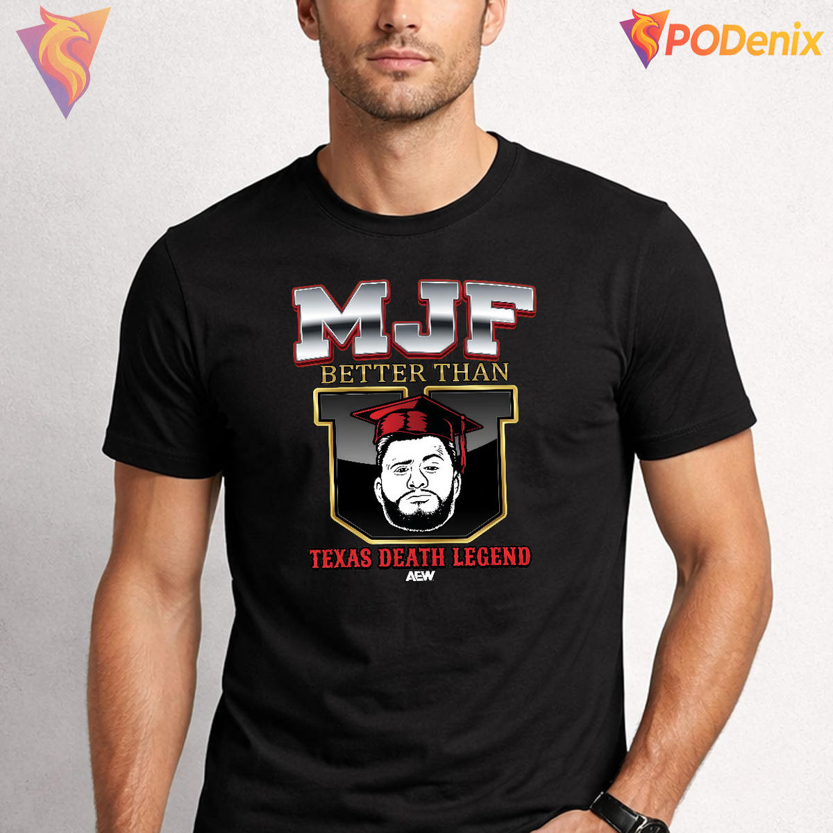 This unapologetic graphic tee puts MJF front and center, featuring a stylized portrait of the wrestling prodigy wearing a graduation cap, nestled inside a bold collegiate “U”. The design is heavily accented by his famous initials, filled with a recognizable luxury plaid pattern and bordered by aggressive red outlines. Flanked by the legendary phrases “BETTER THAN” and “TEXAS DEATH LEGEND,” this artwork delivers a high-end, egotistical vibe that flawlessly represents his championship-level persona.