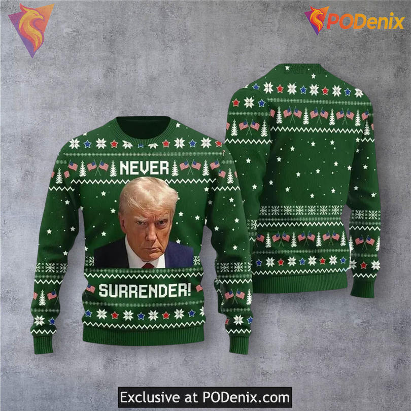Product Details for Trump Never Surrender Patriotic Graphic Statement Holiday Christmas Sweater: