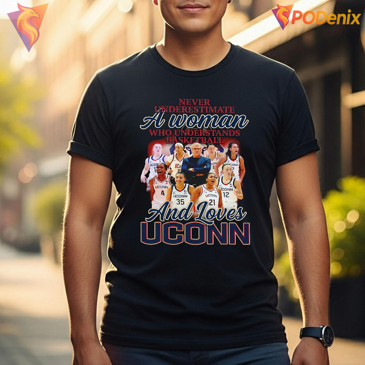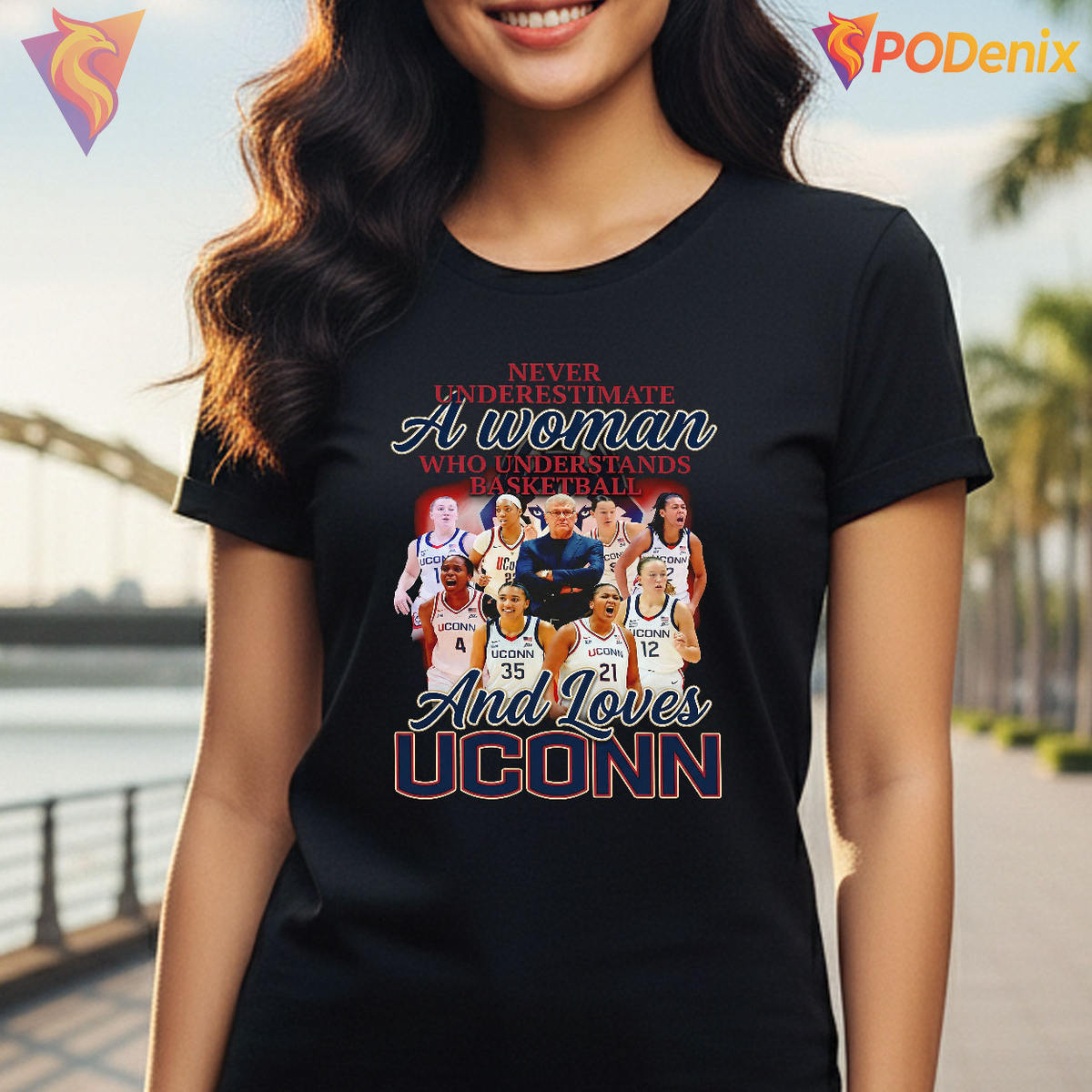 Make a bold statement on game day with this striking black graphic tee that celebrates female athleticism and undeniable team loyalty. Designed for the ultimate fan, this UConn women’s basketball shirt features a powerful message: “Never Underestimate A Woman Who Understands Basketball And Loves UConn,” surrounded by dynamic action shots of the team’s star players and legendary coach.