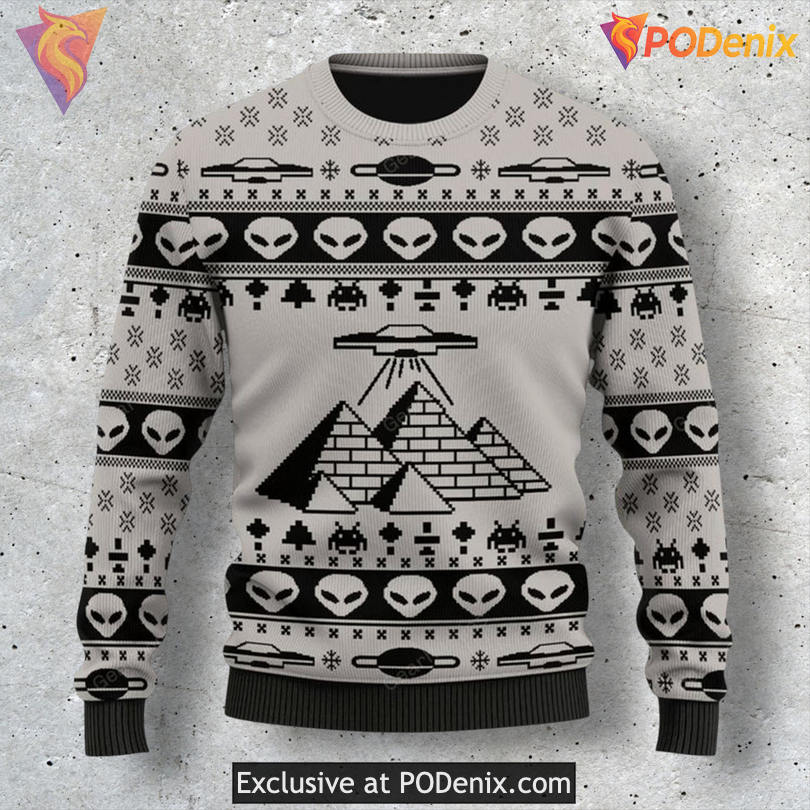 Explore Sci Fi Themed Alien Holiday Apparel with UFO Pyramid Designs