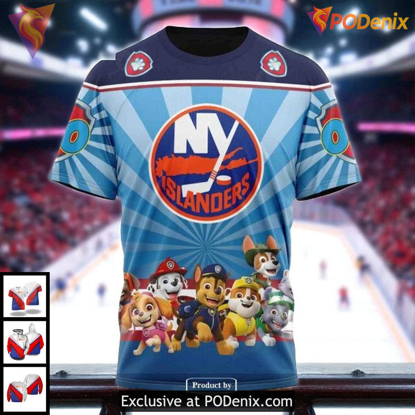 Unisex New York Islanders All Over Print Hoodie brings together the energy of NHL hockey with the playful world of Paw Patrol. The design highlights the Islanders logo and the cheerful pups, capturing the quote Any Name Any Number on the back. A fun, personal, and vibrant way to show your team spirit.