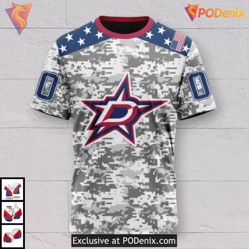 Celebrate your love for the game and honor those who served with the striking Dallas Stars Womens Hoodie. This custom dallas stars womens camouflage hoodie features a unique camo design, perfect for showcasing your passion while blending into the atmosphere of any event.