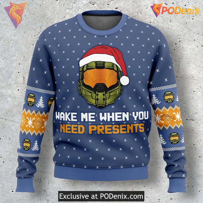This festive Holiday Sweater features a playful design inspired by the beloved quote from the Halo game, “Wake Me When Presents Arrive.” The vibrant colors and charming graphics capture the spirit of the holidays, making it a perfect addition to your seasonal wardrobe.